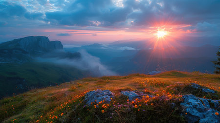 Beautiful mountain landscape with blooming wildflowers in the foreground and sun shining over majestic mountain peaks during sunset