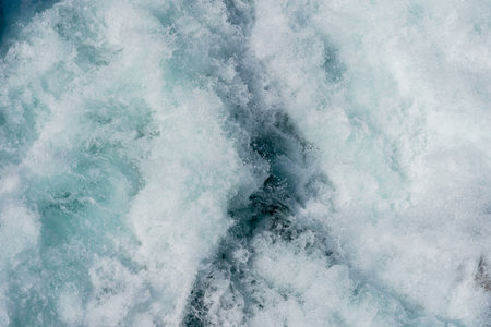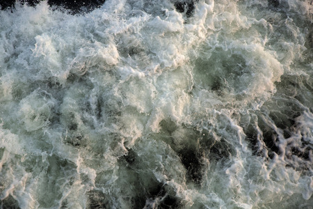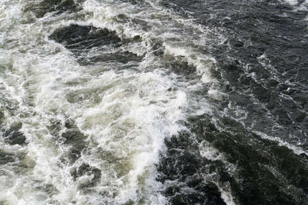 Nature background concept. Rough, foaming water in sea leaving path after boat