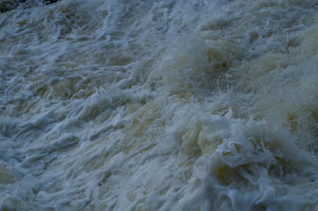 Background of stormy boiling water falling from a great height of the dam during the spring flood.
