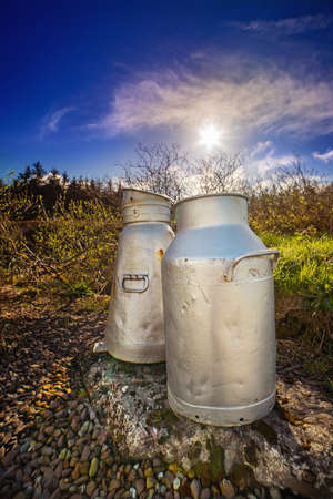 Close view of two aluminum milk cans on the roadside in a county Cork. Ireland.