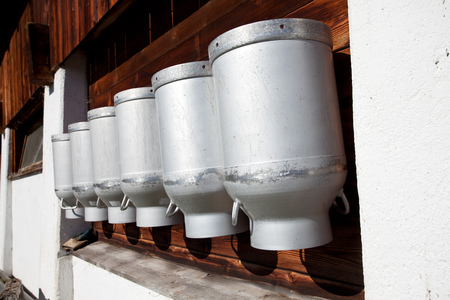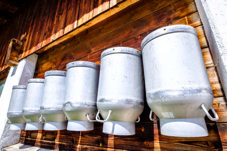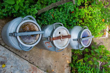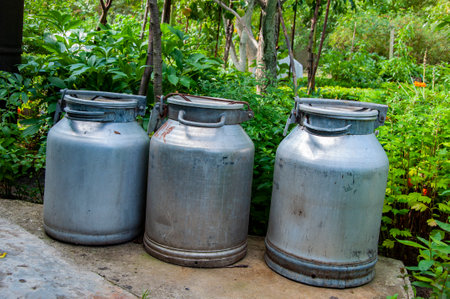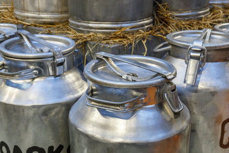 Aluminum big watering can. Traditional dairy farming. Countryside lifestyle. Local milk supply. Retro milk can. Old aluminum milk cans at dairy farm. Milk container rural scene. Fresh delivery.