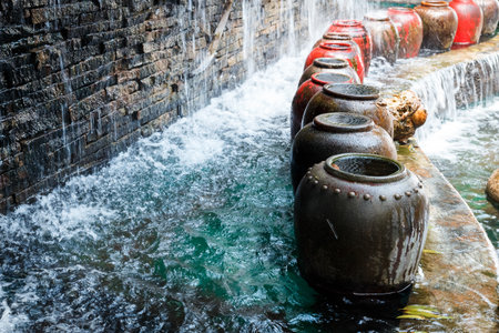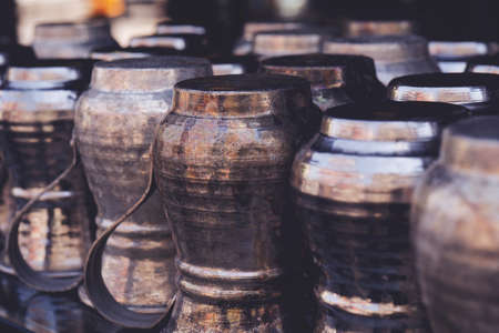 Ancient Vietnamese traditional pots overgrown with seashells.