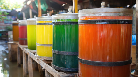 This image showcases a vibrant arrangement of colorful rusted oil drums on a barge, providing a striking aerial perspective over calm river waters in an industrial landscape.