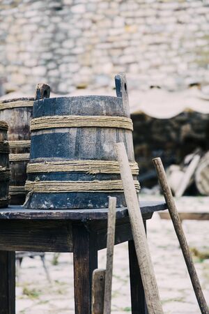 Old wooden mortars with pistils in them. Old home utensils for grains grinding.