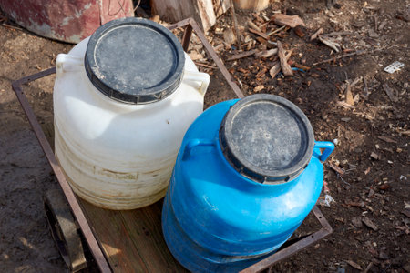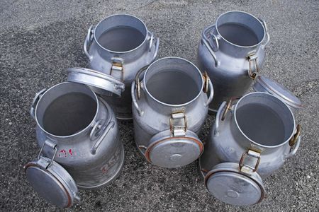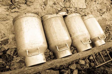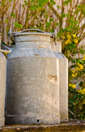 Vintage milk can. Old aluminum milk cans at dairy farm. Milk container rural scene. Fresh delivery. Aluminum big watering can. Traditional dairy farming. Countryside lifestyle. Local milk supply.