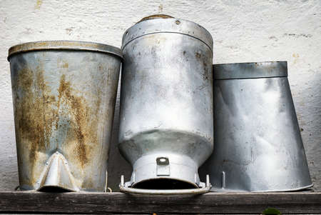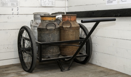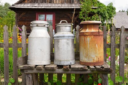 Old milk cans in The Folk Culture Museum in Osiek by the river Notec, the open-air museum presents polish folk culture. Poland, Europe