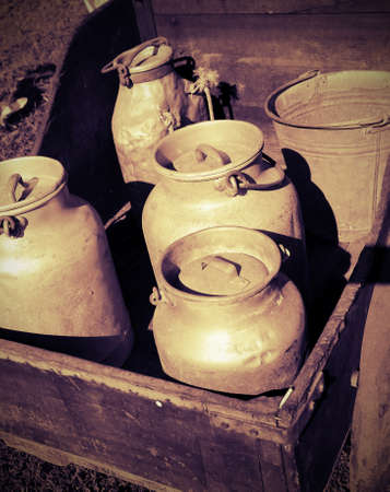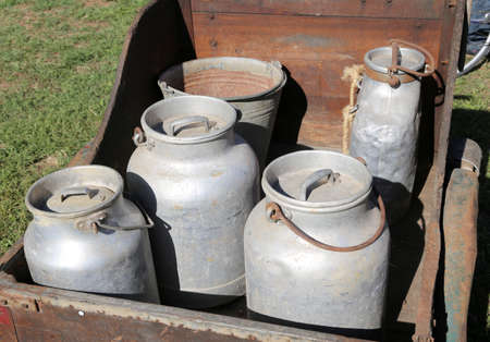 many old aluminum milk cans with lids to the transport of fresh milk in a wooden cart