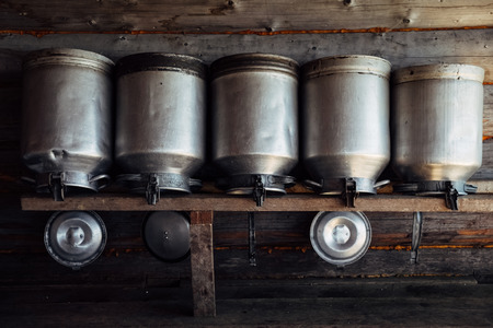 Interior of mountain village cheese farm in Ukraine. Big can for milk