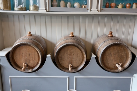 Old wooden barrels with corn, rice and buckwheat in market place.