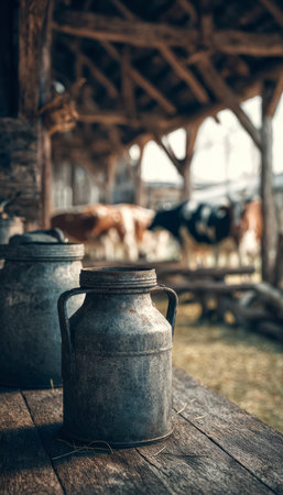 A weathered metal container rests on a rustic wooden surface, with bustling cows in the distance, evoking rural charm and farm life authenticity.