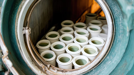 A close-up view of industrial containers arranged inside the chamber of a large machine. The scene highlights organization and efficiency in a manufacturing space.