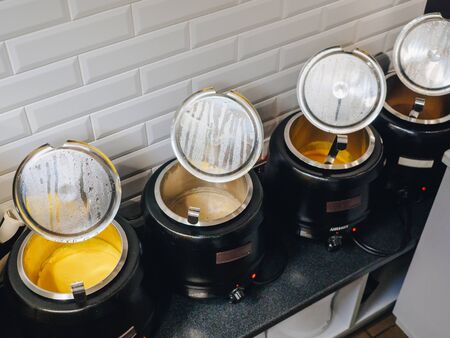 colored clay pots on the counter of the store abstraction background retro design, interiors design decoration design