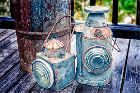 Vintage green iron cylinder bucket on shelf with beautiful light