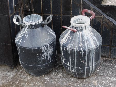 Cuisine and Food, Two Vintage Milk Cans or Small Milk Churns Standing Together on The Shelf.