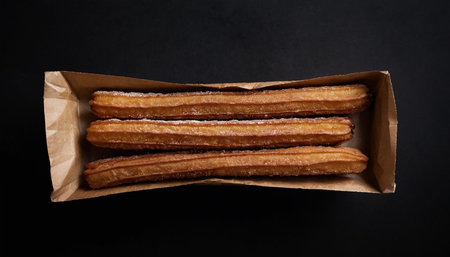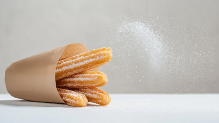 Crispy churros served in a rustic brown paper bag with a light sugar dusting, perfect for a sweet treat or snack. Ideal for food enthusiasts and culinary lovers.