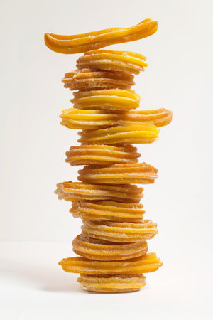 A tower made of churros against a white background. Churros are a type of fried dough pastry, often covered in sugar and can be enjoyed with various dips or fillings.