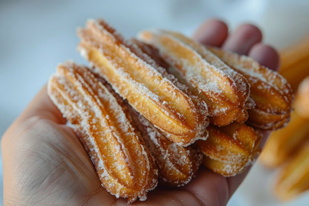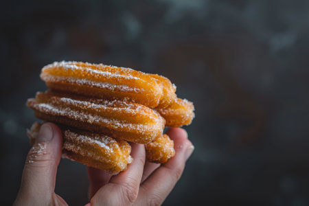 Churro Sticks in Hand, Churros Pastry, Fried Spanish Dessert, Churro Sticks Closeup, Copy Space, Generative Ai Illustration