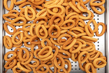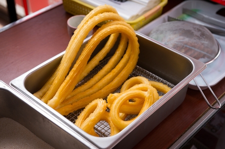 Process of cooking homemade crunchy yellow churros in boiling oil at summer outdoor food market - close up view. Traditional spanich cuisine, cookery, gastronomy, street food concept