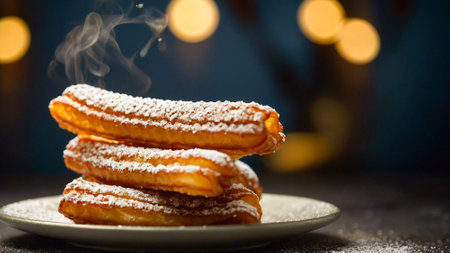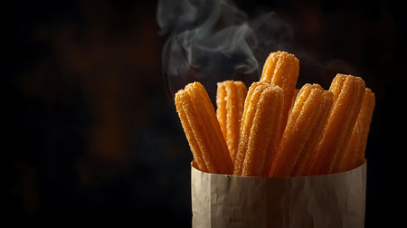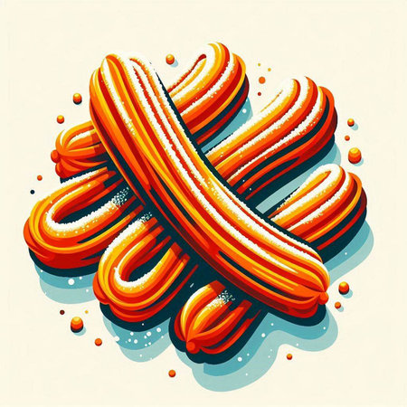 Illustration of hot churros, prepared in the typical style of Spanish cuisine. Illustration generated with AI.