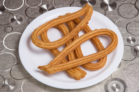 Portion of hot Madrid Churros served on a table. Close up of a plate with churro sticks ready to eat.
