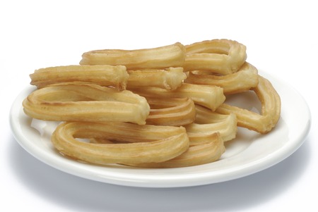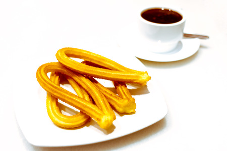 Churros and chocolate traditional spanish breakfast on a plate on white background