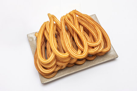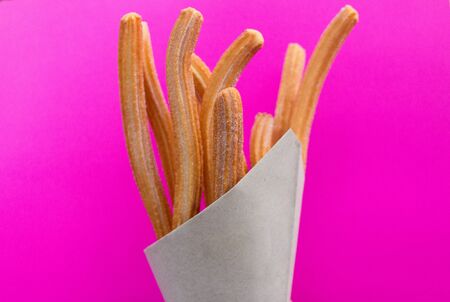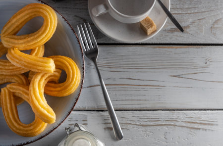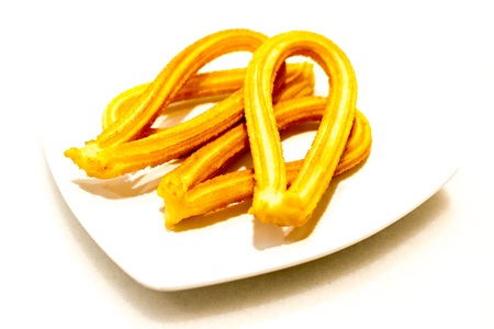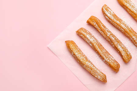 Churros fried sticks on kitchen table. White background. Top view. Copy space