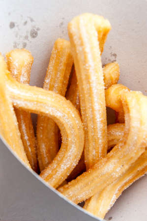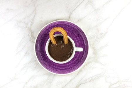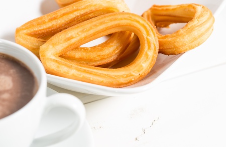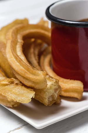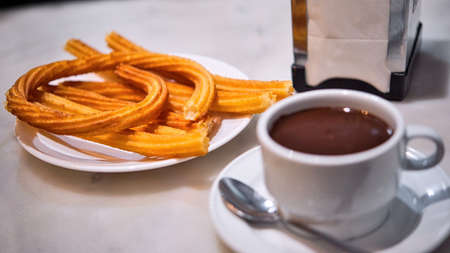 Churros with chocolate, a traditional Spanish sweet food pastry dessert