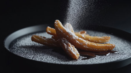 Crispy churros coated in powdered sugar, served with rich chocolate sauce on a sleek black plate, a dessert dream come true