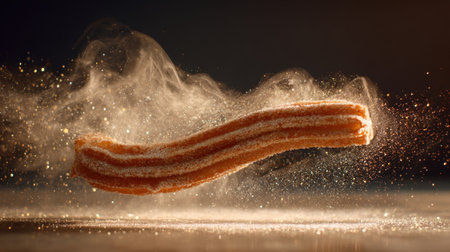 This captivating image showcases a churro elegantly suspended in air, surrounded by sparkling sugar particles, evoking a sense of sweetness and delight.