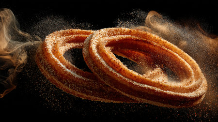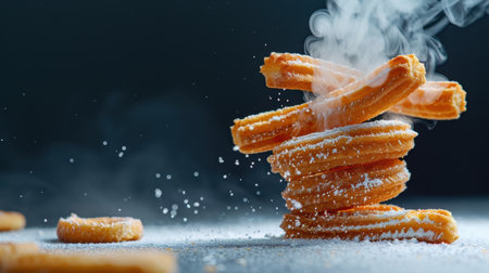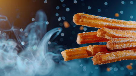This mesmerizing image captures churros levitating above a sugary base, enveloped in soft steam and sprinkled with sugar, creating a tantalizing visual feast.