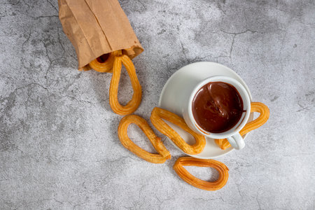 Cup of hot chocolate with paper bag with churros on the plate, typical Spanish breakfast on gray stone background