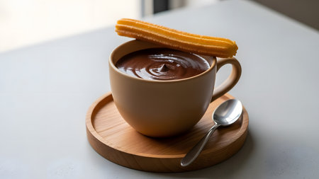A beige ceramic mug filled with thick, rich hot chocolate is served with a golden crispy churro resting across the rim. The cozy dessert is presented on a wooden saucer with a spoon against a clean grey background.