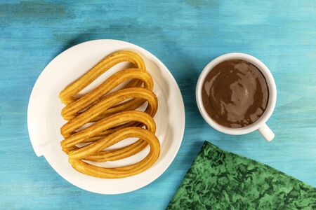 A plate of churros, traditional Spanish, especially Madrid, dessert, particularly for Sunday breakfast, with a cup of hot chocolate, shot from above on a turquoise table with a place for text