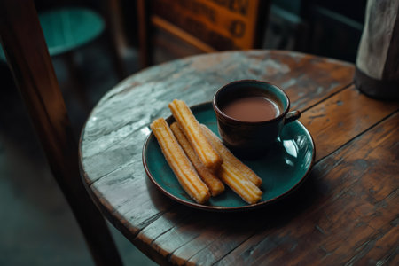 Traditional Spanish churros with hot chocolate breakfast on wooden table
