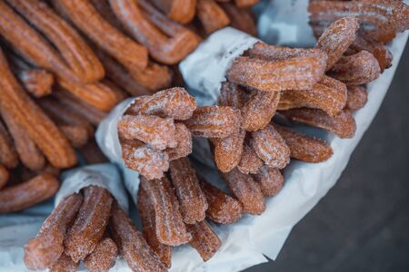 Various of Mexican churros with chocolate. Street food setting. Cultural and global dessert. Homemade biscuits.