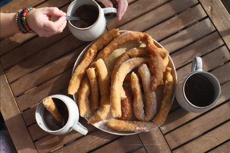 Fried dough, traditional Spanish breakfast churros bathed in chocolate, delivered by a saleswoman to a client.