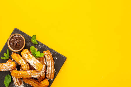 Traditional Mexican dessert churros with chocolate,top view