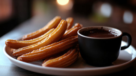 Golden-Brown Churros with Cinnamon Sugar and Rich Chocolate Sauce in Cozy Café Ambiance