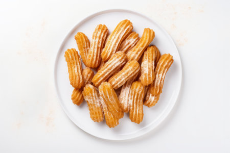 Top view of heap of traditional Spanish dessert churros on the plate