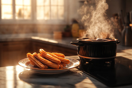 Illustration of hot churros, prepared in the typical style of Spanish cuisine. Illustration generated with AI.