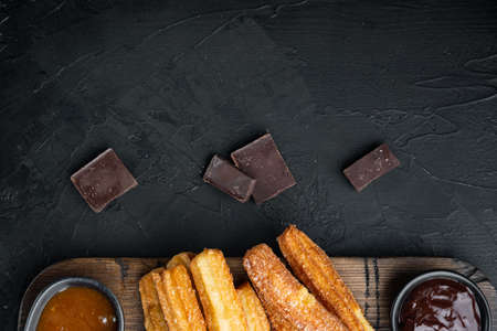 Churros with chocolate, Traditional Spanish cusine, on black background, top view flat lay with space for text, copyspace