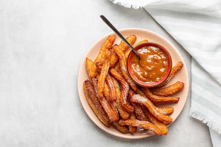 Homemade churros - fried dough, with dulce de leche, slowly heating sweetened condensed milk. Light background. Top view. Copy space.