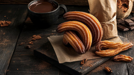 Cinnamon churros dipped in hot chocolate with steam rising creates enticing dessert visual. Dark moody backdrop enhances warmth and comfort. Concept for dessert shops, cafes, food blogs.