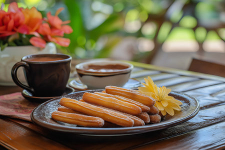Churros and Coffee Served with Flowers on Wooden Table