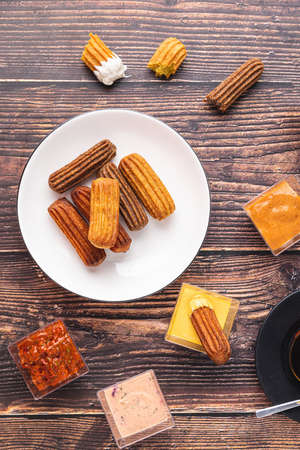 Various of Mexican churros with chocolate. Street food setting. Cultural and global dessert. Homemade biscuits.
