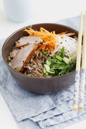 Roasted duck breast with soba noodles, carrot, daikon radish, green onion, and sesame seeds