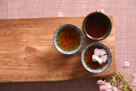Wooden tray with cups and sakura flowers on pink fabric, flat lay. traditional tea ceremony