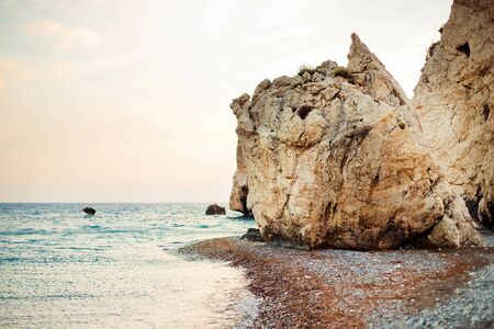 Natural landscape of the Aphrodite rock's on background of Mediterranean sea during sunset. Coast of Cyprus.