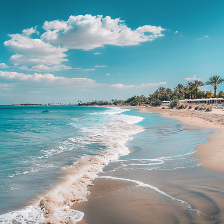 Coast Line on Cyprus with Mediterranean Sea and Palm Tree. Cloudy Sky.