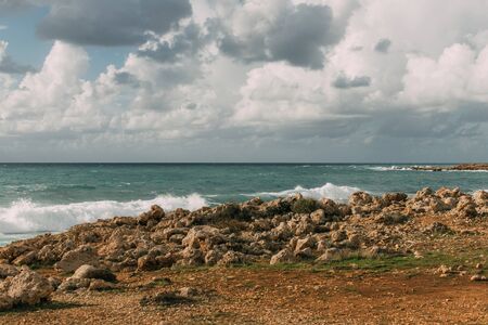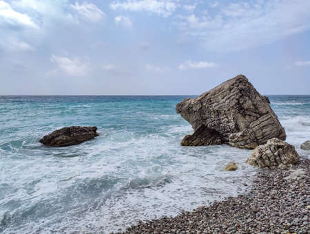 Seascape with windy waves during storm weather at the rocky coastal area of the Rock of Aphrodite in Paphos area, Cyprus.